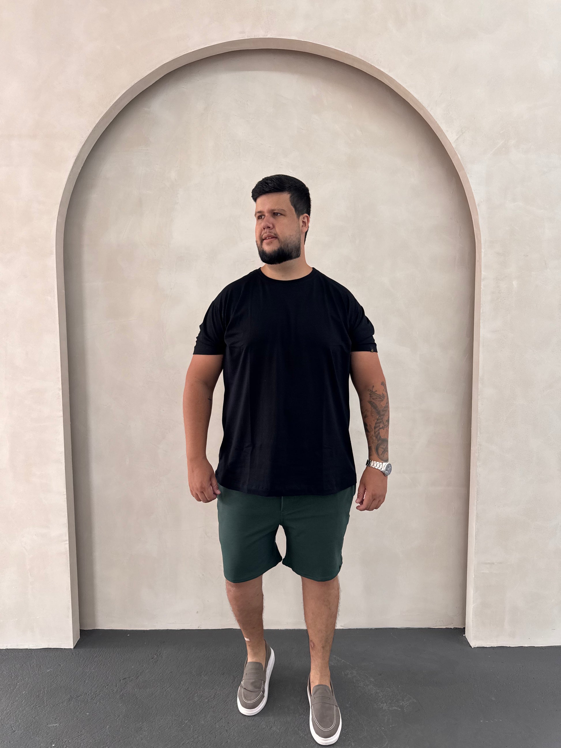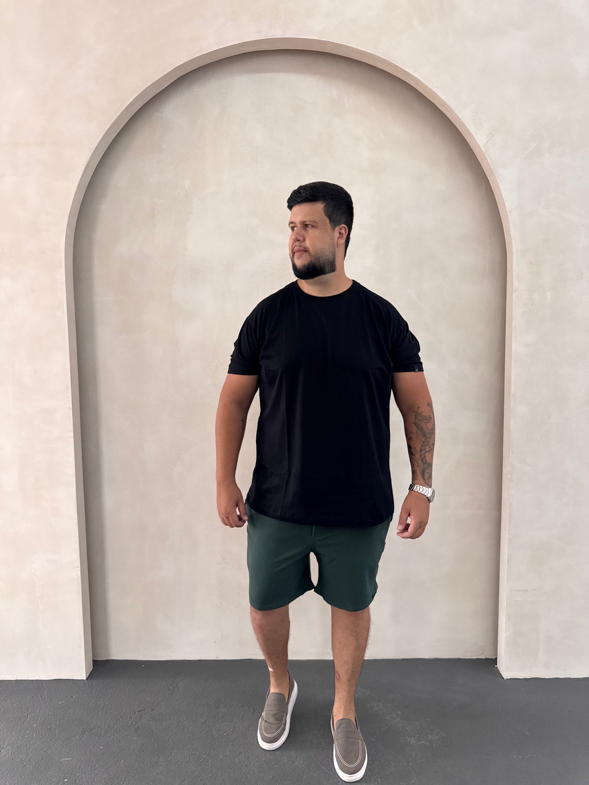 Shorts (Altura): Do cós até a barra na perna.